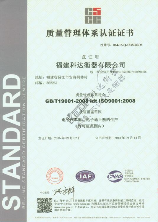 科達地磅通過ISO9001:2008質量認證體系