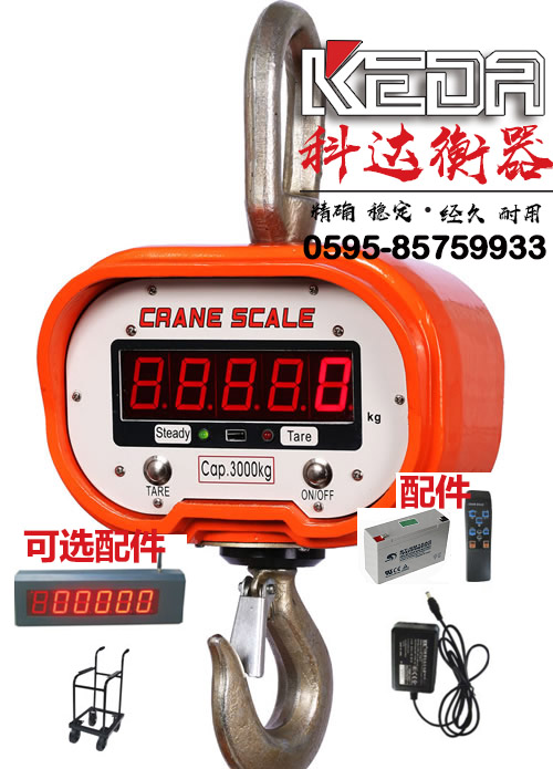 福建科達(dá)衡器有限公司所設(shè)計(jì)生產(chǎn)的漳州吊鉤秤按照數(shù)值顯示的形式可以分為無(wú)線(xiàn)數(shù)傳型電子吊鉤秤(1-50噸)和直視型電子吊鉤秤;其中直視型電子吊鉤秤又可以分為高溫耐熱型電子吊鉤秤(1-30噸),防爆電子吊鉤秤(1-50噸)、高精度電子吊鉤秤(1-50噸)、便攜式電子吊鉤秤(0.1t~1t)、掌上型電子吊鉤秤(手掌稱(chēng) 30kg~300kg)等;按照量程來(lái)分又可以分為:1噸吊鉤秤、2噸吊鉤秤、3噸吊鉤秤、5噸吊鉤秤、10噸吊鉤秤、15噸吊鉤秤、20噸吊鉤秤、30噸吊鉤秤、40噸電子吊鉤秤、50噸電子吊鉤秤。福建科達(dá)衡器所生產(chǎn)的漳州電子吊鉤秤均配有電子吊鉤稱(chēng)專(zhuān)用電池和專(zhuān)用充電器,均可選配無(wú)線(xiàn)大屏幕和小推車(chē)。